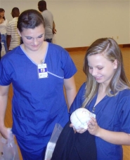 | From left, Kelsey McLaughlin of Hammond High Magnet School and Morgan Horn of Albany High School take a closer look at a model of the human brain at the North Oaks Medical Explorers Career Fair. |