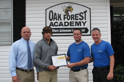 From left: Oak Forest Academy Principal and Head Football Coach Jason Brabham, Tyler Hasson, North Oaks Sports Medicine Athletic Trainer Joshua Dawsey and North Oaks Sports Medicine Supervisor Jeff Schmitt.