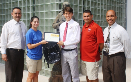 From left are St. Thomas Aquinas Regional Catholic High School Principal Jose' Becerra, North Oaks Sports Medicine Athletic Trainer Vanessa Taormina, honoree Tommy Brocato, Head Cross Country Coach Miguel Becerra and Advancement Director Errol Gauff.