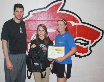 From left are Loranger High Head Girls Basketball Coach Sean Shields, Bailey Lee and North Oaks Sports Medicine Athletic Trainer Whitney Adams.