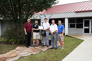 From left are: St. Thomas Aquinas Regional Catholic High School (STA) Principal José Becerra, North Oaks Sports Medicine Athletic Trainer Jonathan Ferguson, Logan Thompson, STA Head Football Coach John White and North Oaks Sports Medicine Supervisor Jeff Schmitt.