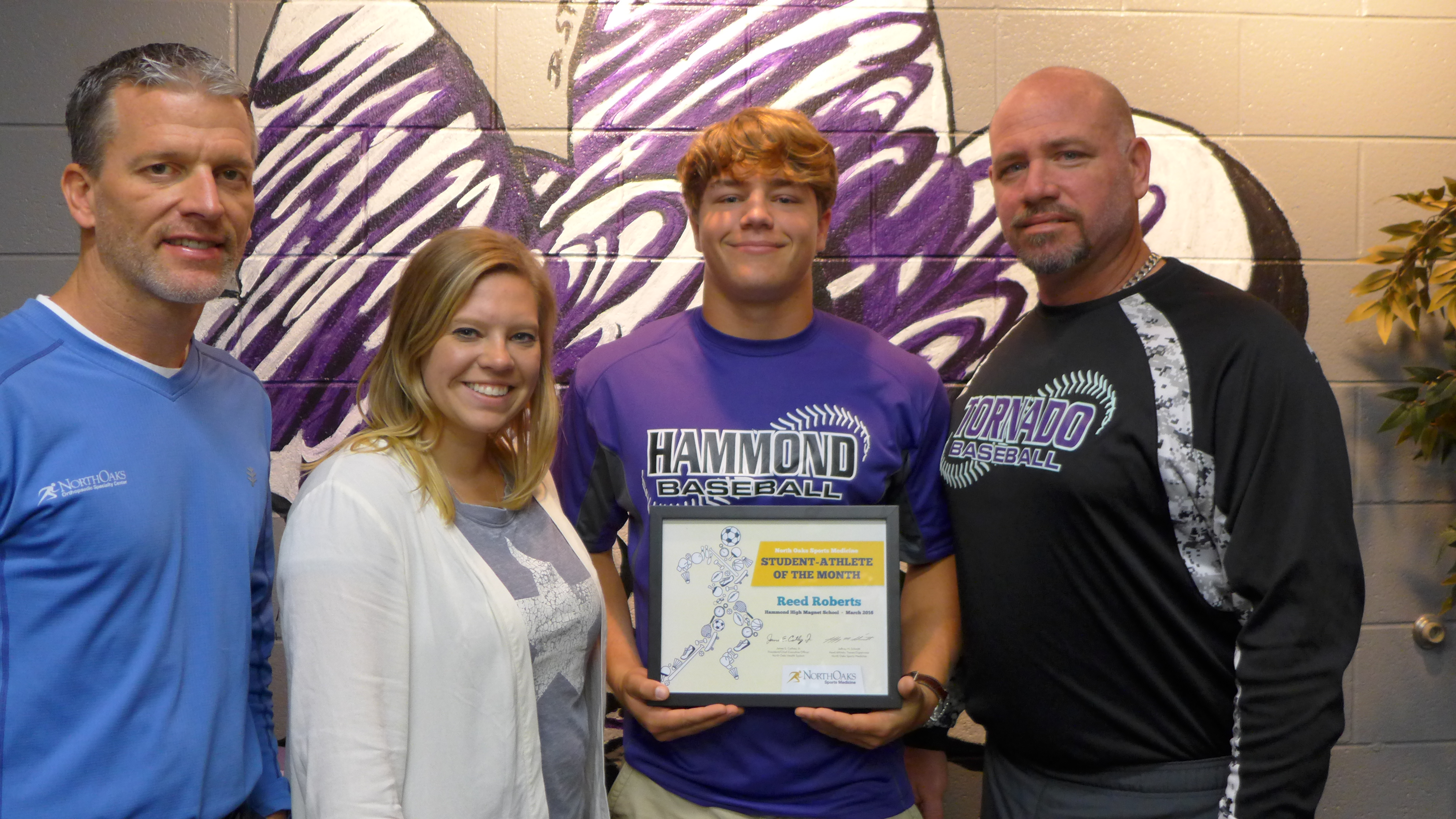 From left are North Oaks Sports Medicine Senior Athletic Trainer Jeff Schmitt, North Oaks Sports Medicine Athletic Trainer Kerrin Sitman, Reed Roberts and Hammond High Magnet School Head Baseball Coach Stephen Ceravalo.