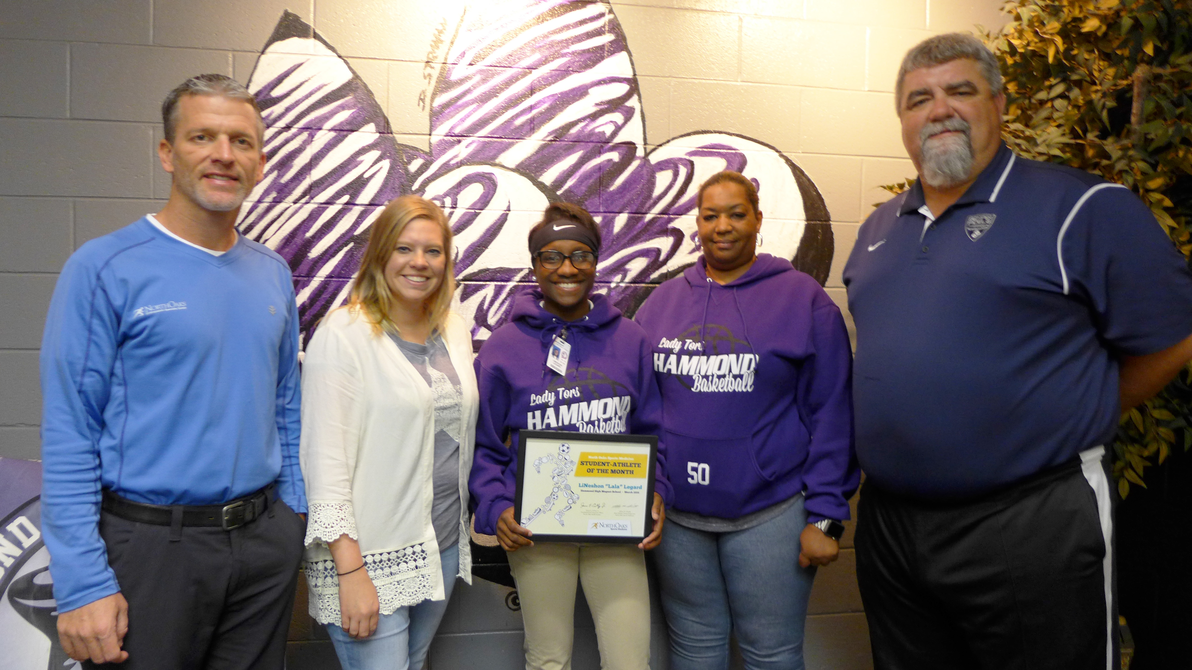 From left are North Oaks Sports Medicine Senior Athletic Trainer Jeff Schmitt, North Oaks Sports Medicine Athletic Trainer Kerrin Sitman, LiNeshon “Lala” Legard, Hammond High Magnet School Head Girls Track Coach Kovi Dillon and Hammond High Magnet School Head Track Coach Cecil Thomas.
