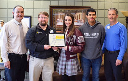 From left, St. Thomas Aquinas High School Principal Jose' Becerra, North Oaks Sports Medicine Athletic Trainer Jonathan Ferguson, Meghan Becerra, St. Thomas Aquinas High School Head Cross Country Coach Rosendo Vallejos and North Oaks Sports Medicine Senior Athletic Trainer Jeff Schmitt.