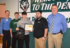 From left, North Oaks Sports Medicine Senior Athletic Trainer Jeff Schmitt, Maurepas High School Head Basketball Coach Brett Vampran, Tre' Lessard, Sports Medicine Athletic Trainer Jonathan Gantt and Maurepas High School Principal Kenny Kraft.