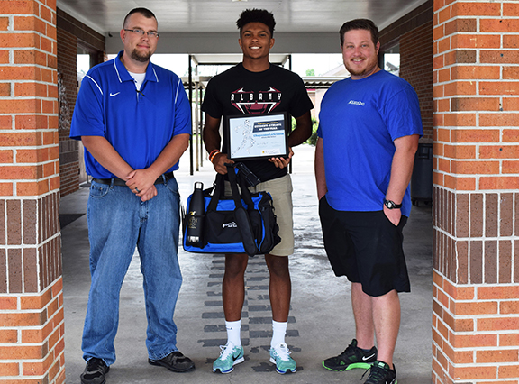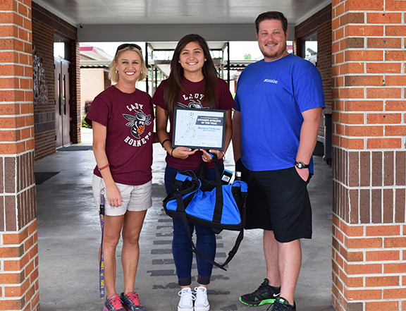 From left are Albany High School Head Football Coach and Athletic Director Blane Westmoreland, Cheyenne Labruzza and North Oaks Sports Medicine Athletic Trainer Nate Borget.