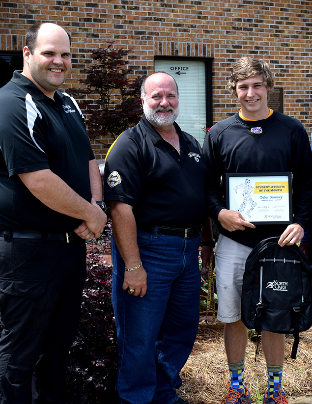 From left are North Oaks Sports Medicine Athletic Trainer Matt Stumpf, Doyle High School Athletic Director Bradley Watts and Tyler Dawsey.