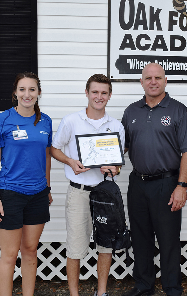 From left are: North Oaks Sports Medicine Athletic Trainer April Baize, Hayden Dupuy and Oak Forest Academy Principal and Head Football Coach Jason Brabham