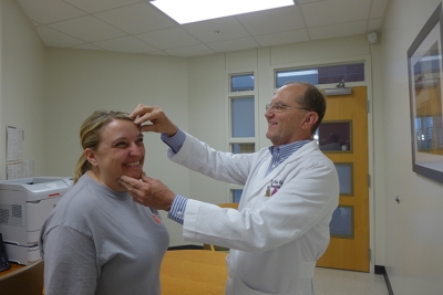 Also at the Livingston Physical Day, about 50 parents and coaches received stroke risk assessments from Dr. Joseph Heneghan of North Oaks Primary Care Clinic-Walker while Drs. Rebecca Soine and Frank Henchy of North Oaks Dermatology Associates provided more than 30 free skin cancer screenings. Pictured above, Jessica Crayton of Albany gets a skin cancer screening from Dr. Frank Henchy while her daughter, Alyssa, an Albany High School cheerleader, receives a physical examination.