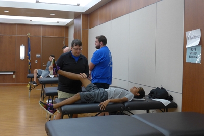 Fifteen doctors and five nurse practitioners, along with 58 athletic trainers and employees, volunteered for the event May 20 at North Oaks-Livingston Parish Medical Complex. Pictured above, athletic trainer Jeremy Kulbeth gives Westside Junior High School’s Jesse Lopez an orthopedic check. Lopez is on the cross-country and track and field teams.