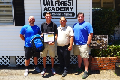 Cleveland is pictured, from left, with North Oaks Sports Medicine Athletic Trainer Matthew Rabalais, Oak Forest Academy Head Baseball Coach Tony Salim and North Oaks Sports Medicine Head Athletic Trainer/Supervisor Nate Borget.