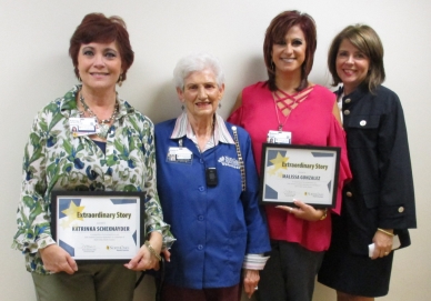North Oaks Health System President/CEO Michele Sutton recently presented Volunteer Manager Malissa Gonzalez and Gift Shop Manager Katrinka Schexnayder with Extraordinary Story Awards for rescuing a coworker in her time of need.
