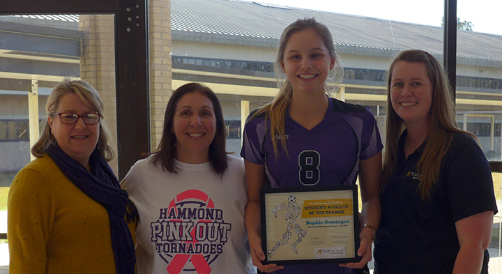 With a 3.65 GPA, senior student Sophie Domingue has played volleyball for four years at Hammond High Magnet School. She is pictured above, second from right. Also pictured, from left, are: Hammond High Magnet School Principal Shelly Gaydos, Head Volleyball Coach Amber Babin and North Oaks Athletic Trainer Kacie Edwards.