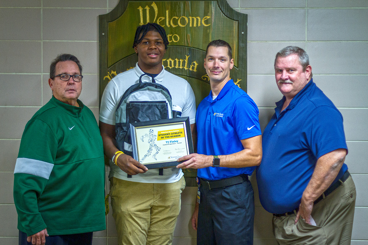 Ponchatoula High School quarterback TJ Finley, who has played football for the Green Wave for three years, is a leader on and off the field, according to Brett Vampran, assistant football coach at Ponchatoula High School. He is pictured above, second from left. Also pictured, from left, are: Ponchatoula High School Assistant Football Coach Brett Vampran, North Oaks Athletic Trainer Nicholas Owens and Ponchatoula High School Principal Danny Strickland.