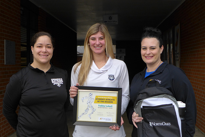 Springfield High School senior Tabby Lobell has a 4.04 GPA and has played volleyball for eight years. She is pictured above, center. Also pictured, from left, are: Springfield High School Head Football Coach Sara Short and North Oaks Athletic Trainer Mandy Serpas.