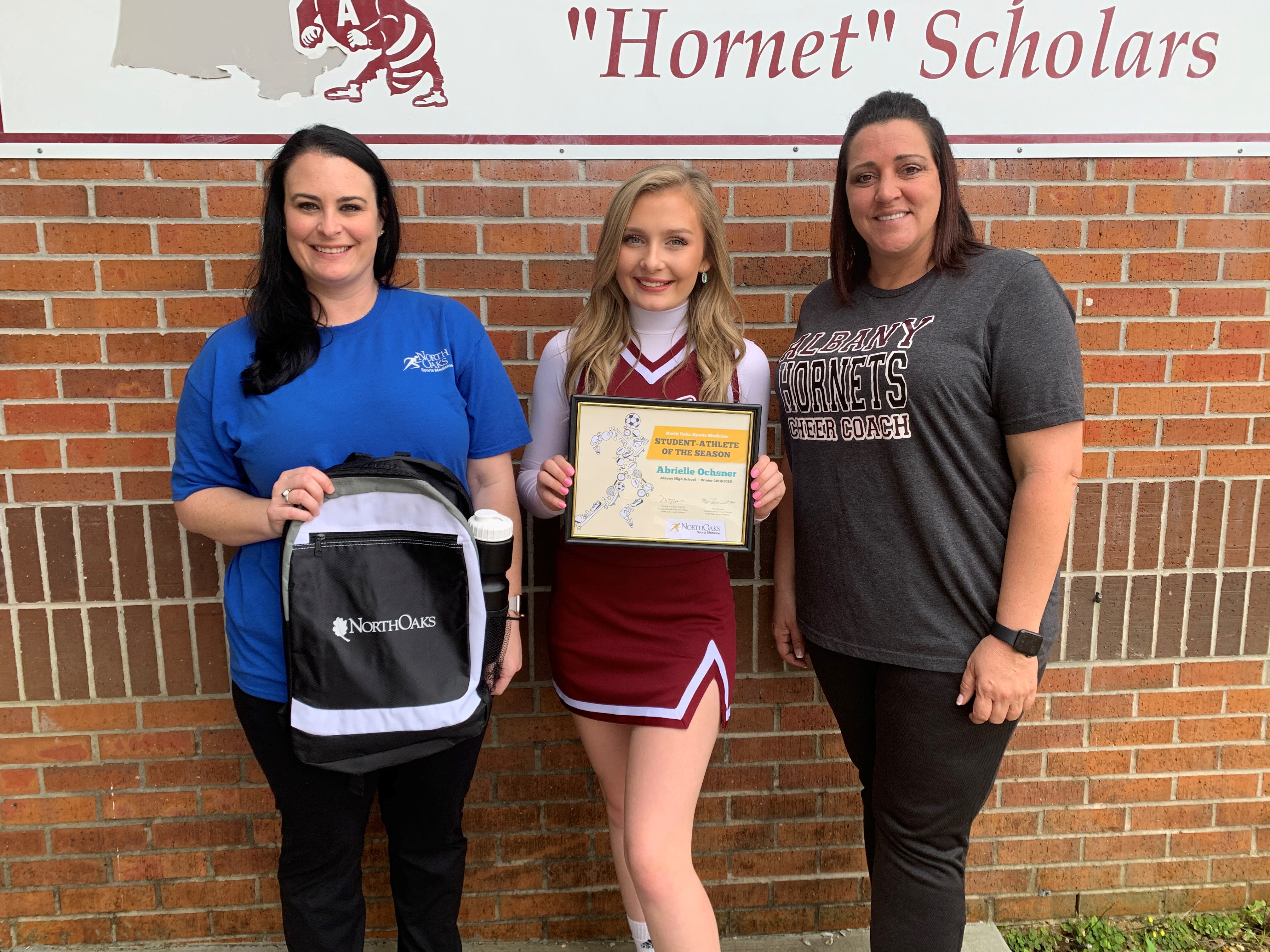 Albany High School sophomore Abrielle Ochsner has cheered for the Hornets for two years. She is pictured at center with North Oaks Sports Medicine Athletic Trainer Mandy Serpas and Albany High School Cheer Sponsor Deloy Duhon.