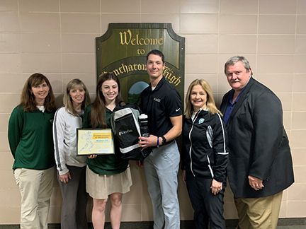 Senior Madison Gill plays point guard for the Ponchatoula High School Lady Greenwave Basketball team and maintains a 4.0 GPA. She is pictured third from left with Ponchatoula High School Assistant Girls Basketball coaches Lauren Long and Kristi Gill, North Oaks Sports Medicine Athletic Trainer Nicholas Owens, Ponchatoula High School Head Girls Basketball Coach Patricia Landaiche and Principal Danny Strickland.