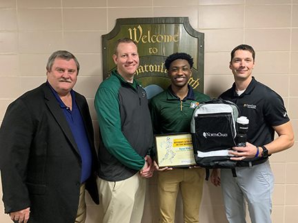 With a 4.0 GPA, Ponchatoula High School Junior Ryan Elzy has played basketball for the Green Wave for three years. He is pictured third from left with Ponchatoula High School Principal Danny Strickland and Head Boys Basketball Coach Tom Taylor, and North Oaks Sports Medicine Athletic Trainer Nicholas Owens.