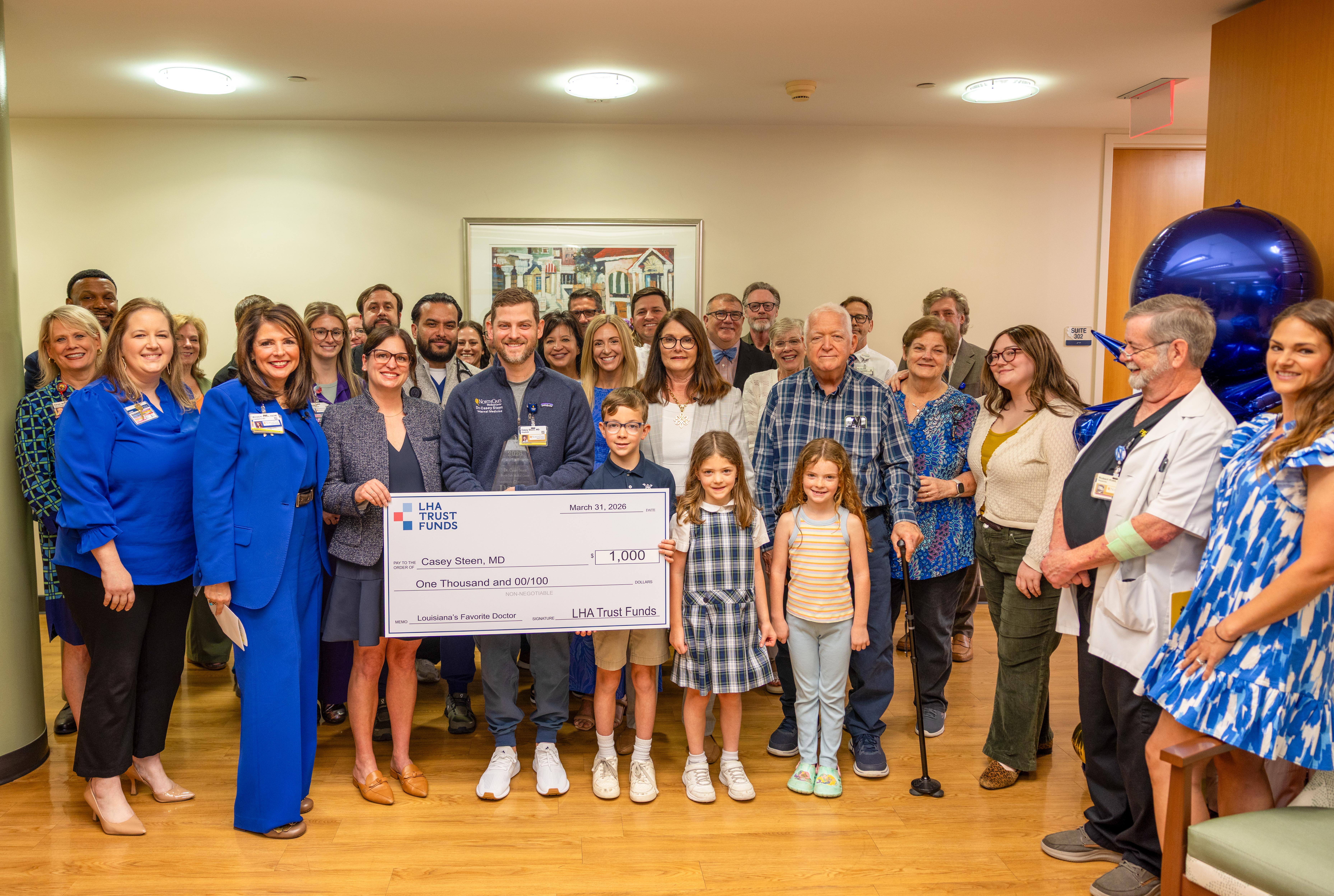 Dr. Steen received the highest number of nominations, earning him the 2026 title. To commemorate his accolades, LHA Trust Funds and North Oaks Health System celebrated Dr. Steen with a surprise presentation on National Doctors’ Day.