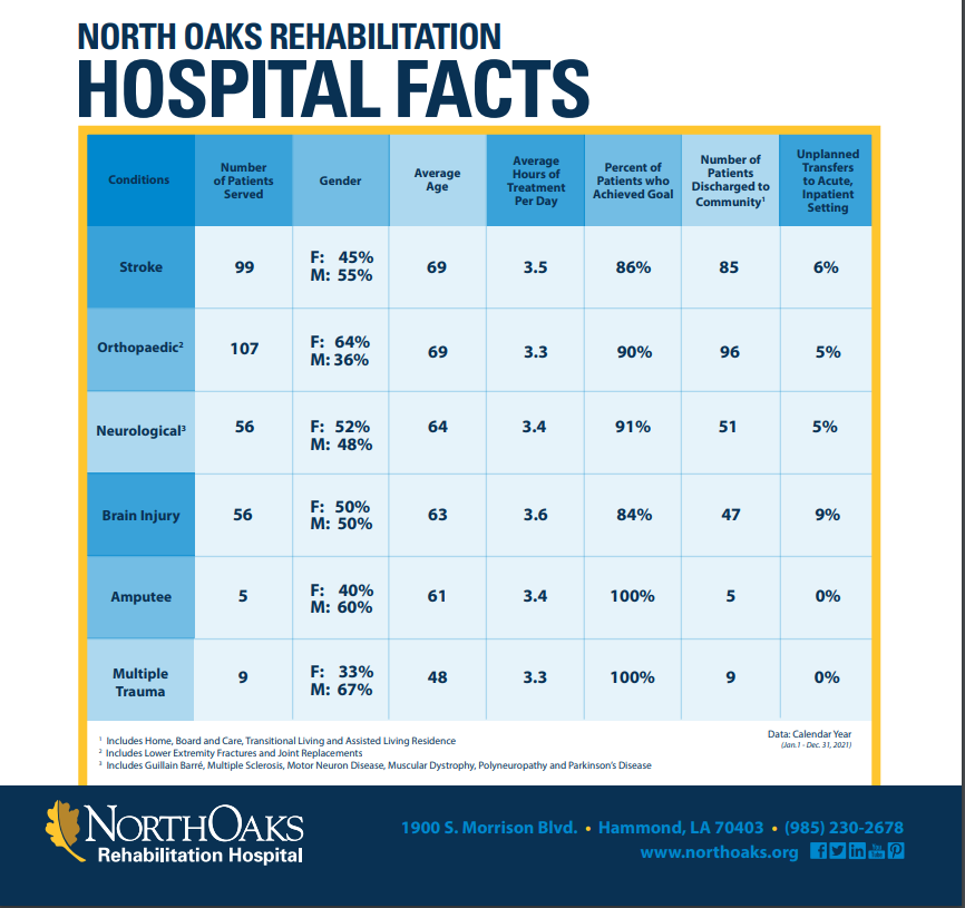 Click here to see a chart of North Oaks Rehabilitation hospital facts.*