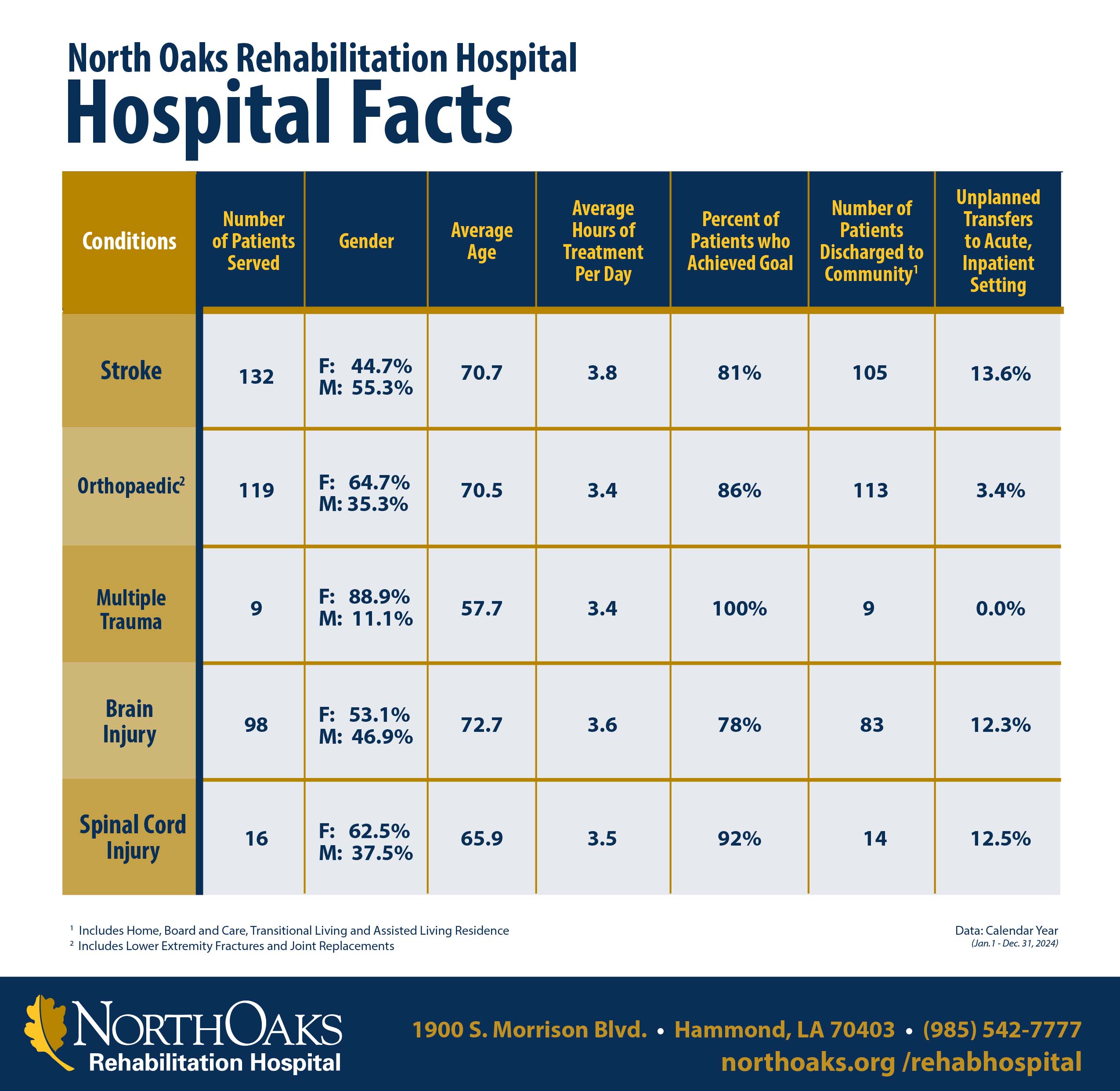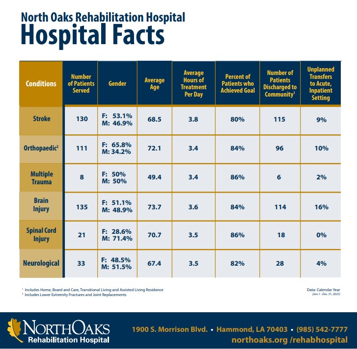 North Oaks Rehabilitation Hospital, a free-standing, acute 24-hour-a-day facility, specializes in treating adults with significant injuries or illnesses requiring intensive rehabilitation to regain independent function. We prioritize transparency and empower our patients and their families with comprehensive information necessary for making informed care decisions.